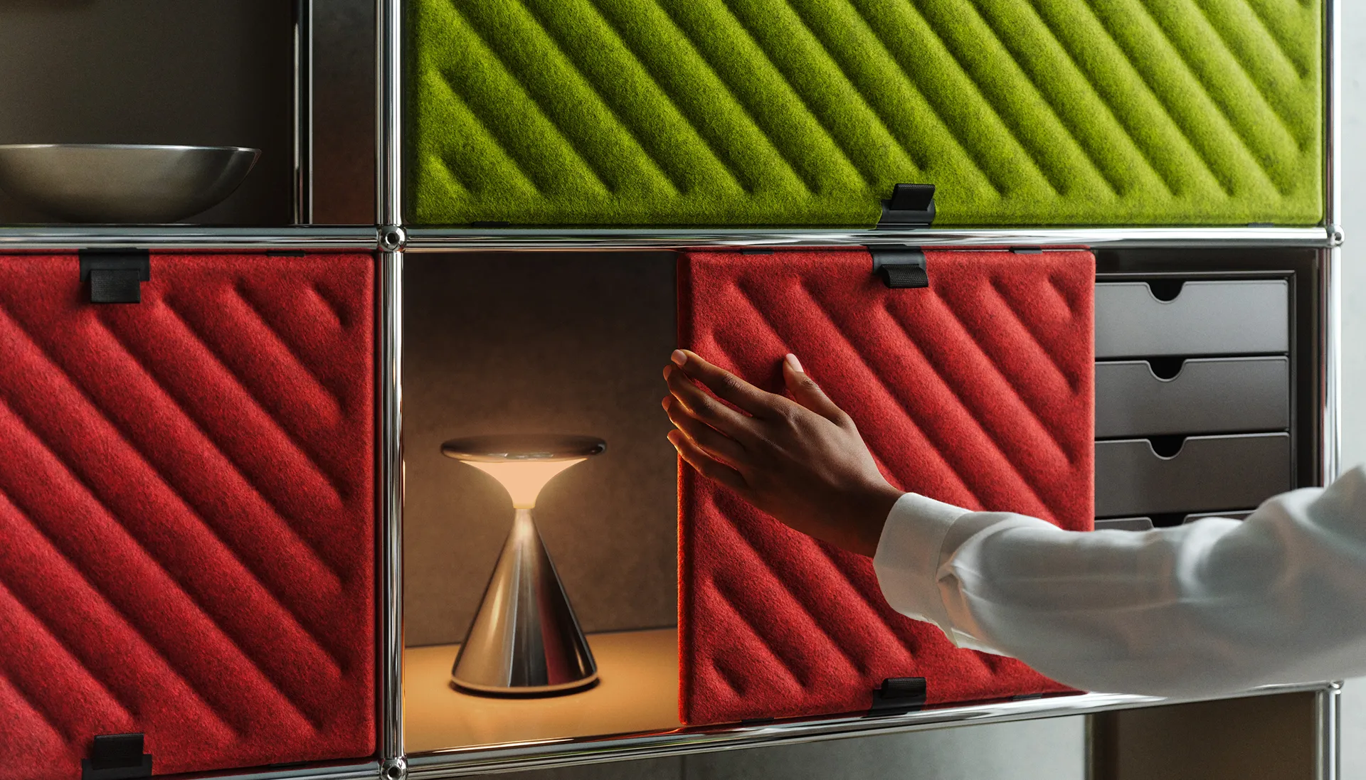 Gemütlichkeit pur mit USM – Dein stilvolles Highboard mit beleuchtetem Barfach